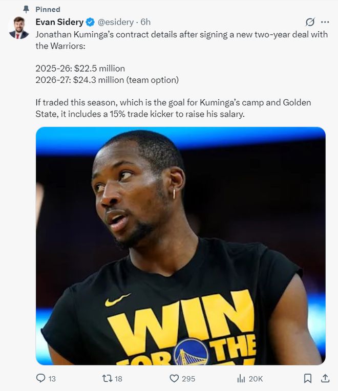 北京时间10月5日,NBA记者埃文-斯迪瑞透露,乔纳森-库明加与勇士队签下的合同实际上是两年4680万,而不是两年4850万,因为这份合同包含了15%的交易保证金,勇士队为了凑齐15人名单,库明加25-26赛季的起薪只能是2250万。